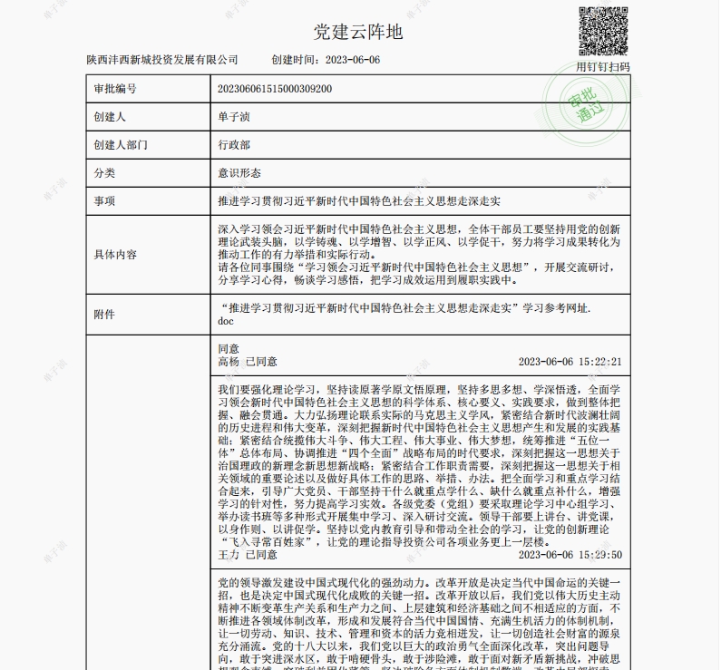 除線下面對面、點(diǎn)對點(diǎn)宣講外,灃西投資在釘釘黨建云平臺、微信群發(fā)起交流討論活動,不斷擴(kuò)大宣講知識的覆蓋面和感染力,切實做到入腦入心。