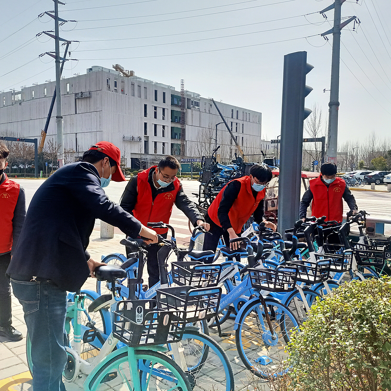 志愿者來到西部云谷一期東南角,將隨意停放在路邊的共享單車進行了統(tǒng)一規(guī)范整理,集中搬至規(guī)定的區(qū)域停放。同時,積極引導群眾正確停放共享單車,并呼吁過往群眾,自覺愛護身邊的共享單車,做文明的騎行者、停放者、宣傳者。隨后,志愿者們手拿抹布和酒精噴壺, 仔細對共享單車的車身、車鎖、底板進行清潔。