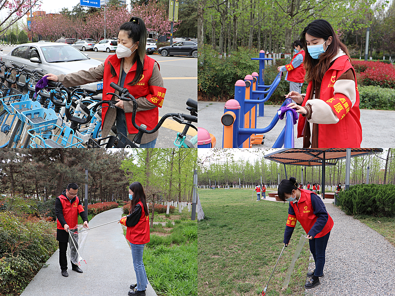 志愿者們身著紅馬甲,帶著抹布、水桶、垃圾夾等工具,分成兩隊,分區(qū)域?qū)珗@衛(wèi)生進行大掃除。在公園步道,大家一絲不茍地撿拾著道路旁、草叢中的紙屑、塑料袋和煙頭等生活垃圾,對公園座椅和花壇上的塵土進行擦拭,營造整潔環(huán)保的公園環(huán)境;在健身器材區(qū)域,志愿者們用抹布一遍又一遍地對走步機、爬梯和雙杠等器材進行清理,讓群眾使用起來更加便利;在人行道上,志愿者們將隨意停放在路邊的共享單車進行統(tǒng)一整理,逐一搬至規(guī)定的停放區(qū)域,做文明的騎行者、停放者和宣傳者,營造綠色文明出行環(huán)境。