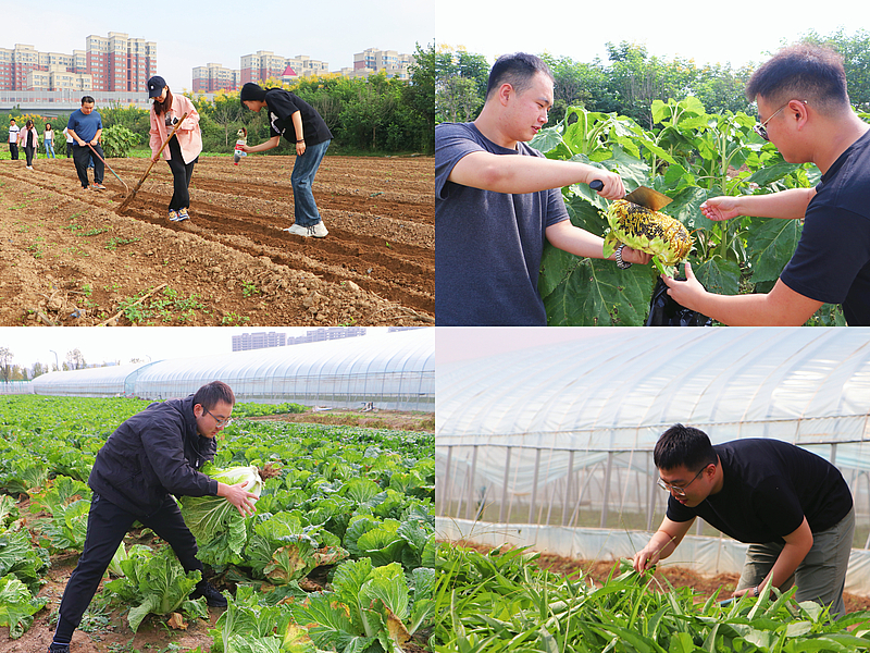 立冬過后,水嫩的蘿卜、翠綠的白菜、黃心的油菜等時蔬長勢喜人,綠浪農(nóng)業(yè)公社的工作人員手持鐮刀向大家示范了采摘的方法技巧。隨后,團(tuán)員青年員工走進(jìn)田壟,或松土刨拔根蘿卜、或左右旋鈕摘白菜、或彎腰掐莖收油菜......一筐筐新鮮的蔬菜承載著豐收的喜悅,大家雖然雙手沾滿泥土,卻樂此不疲。