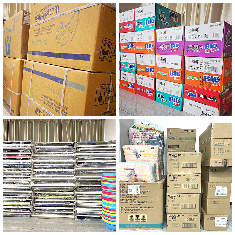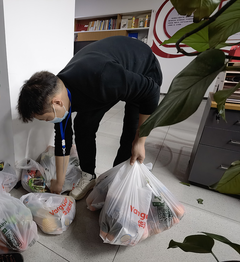 張謹為住在辦公室的同事打包準備慰問品