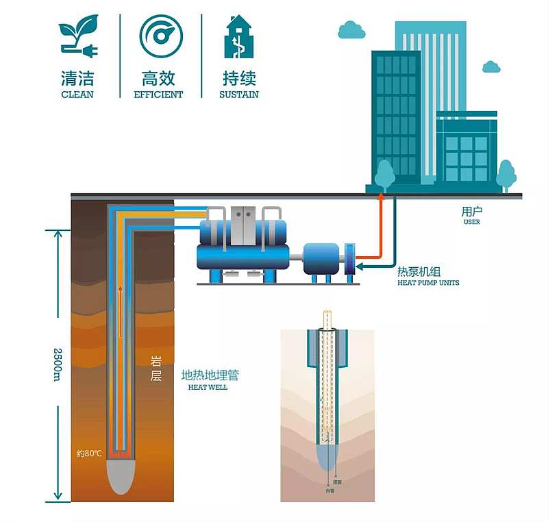集成應用現(xiàn)代鉆采技術(shù)、熱泵技術(shù)和建筑節(jié)能保溫技術(shù),實現(xiàn)了技術(shù)閉環(huán),形成了獨具特色的新一代區(qū)域低溫供熱系統(tǒng)——中深層無干擾地熱能供熱技術(shù)系統(tǒng),將過去不能開采利用的自然地熱資源,變成可供人們利用的經(jīng)濟資源,使地熱資源的規(guī)模成百上千倍地增加。