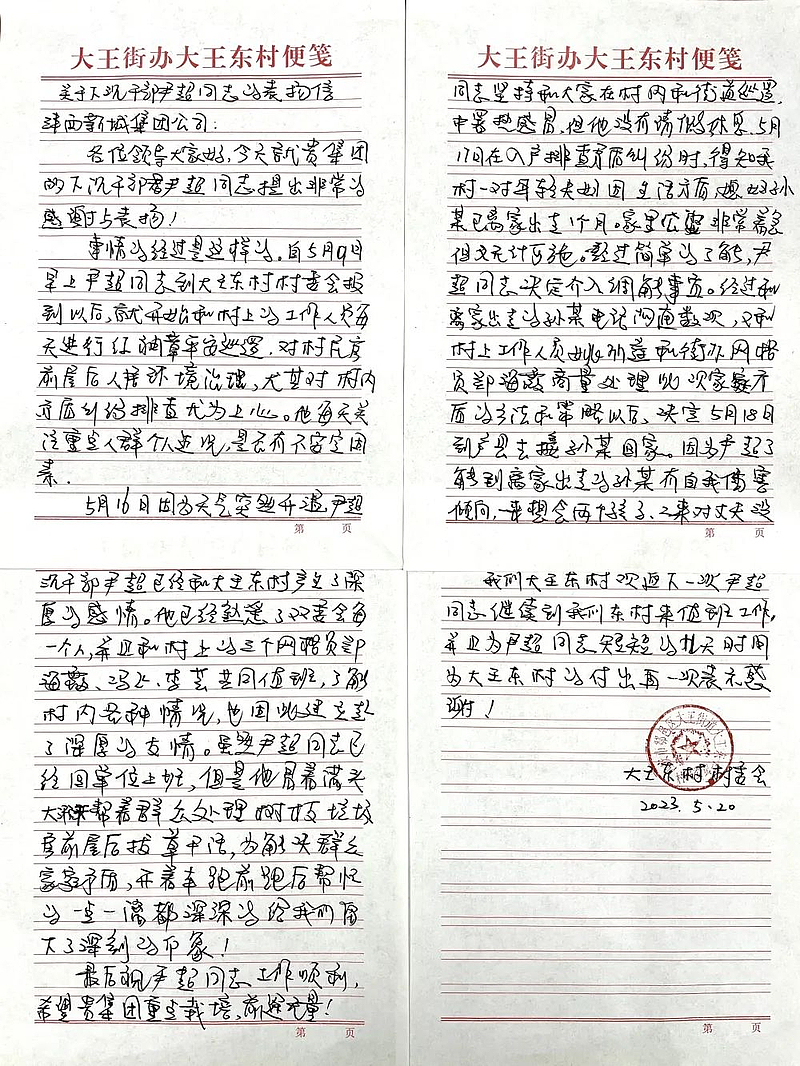 “歡迎房建項目部尹超同志下一次繼續(xù)到我們大王東村來值班工作”——這是一封來自大王東村村委會的表揚信。今天,讓我們一起聽聽房建項目部尹超下村那些事兒。