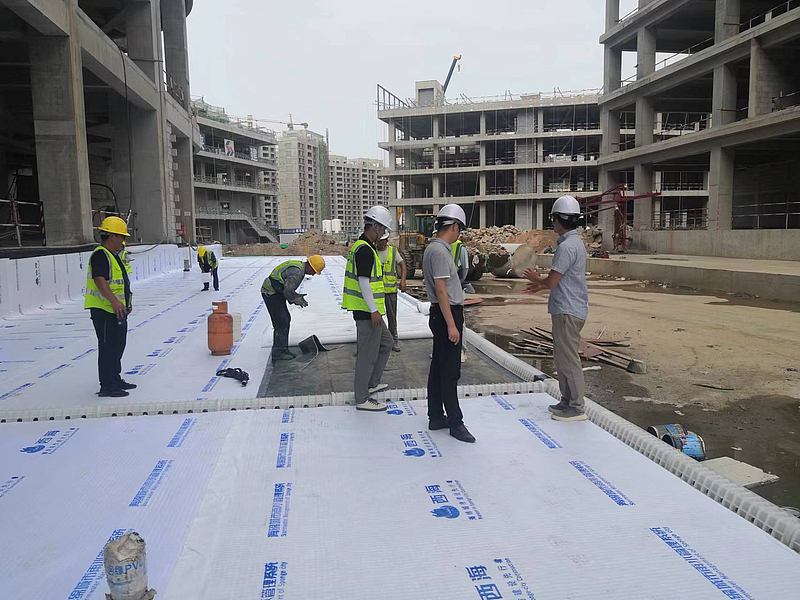 傳統地庫頂板排水技術構造層次復雜,施工不便,且排水效果受找坡層影響較大,同時隨著陸面地表海綿城市建設的推廣,進一步增加了頂板排水壓力,尤其是大面積的車庫頂板,因找坡難度大,極易引起排水系統不暢,從而造成積水,引發滲漏。