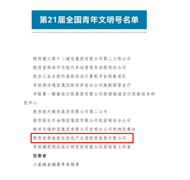 近日,全國創建青年文明號活動組委會成員單位聯合印發《關于命名第21屆全國青年文明號并進行星級認定的決定》,灃西集團信息產業園公司(陜西省西咸新區信息產業園投資發展有限公司)榮獲“一星級全國青年文明號”。