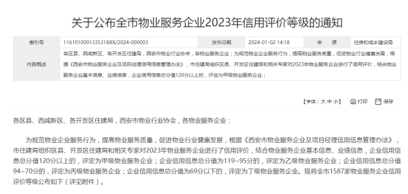 近日,經西安市住房和城鄉建設局組織評審,灃西服務從全市1587家同行企業中脫穎而出,順利評定為“西安市甲級物業服務企業”,公司經營管理、隊伍建設、業績成果等各方面工作獲得綜合肯定。