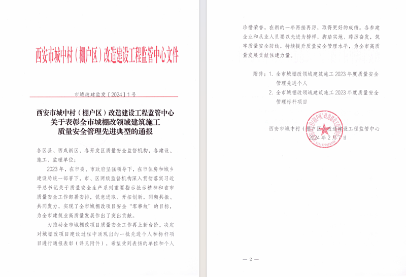 近日,西安市城中村(棚戶區)改造建設工程監管中心發布了《關于表彰全市城棚改領域建筑施工質量安全管理先進典型的通報》,灃西集團建設的江渡新苑南區項目獲評“全市城棚改領域建筑施工2023年度質量安全管理標桿項目”榮譽稱號。