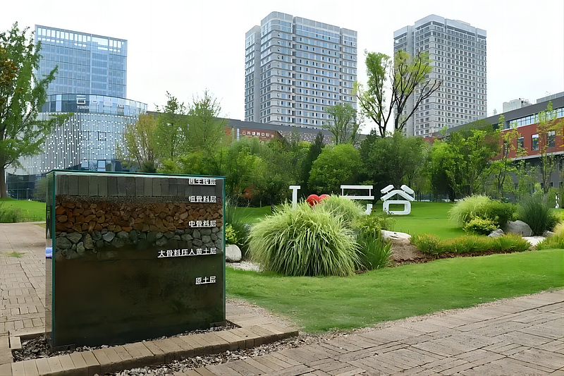 張哲介紹稱,灃西新城還建設了不同類型的小海綿設施,用植草溝、蓄水花園、下凹式綠地、綠色屋頂等替代傳統的地下排水管網,用建筑垃圾制成的透水磚鋪設園區道路,形成了建筑小區、景觀綠地、市政道路及中心綠廊四級雨水收集利用體系。其中,建筑小區解決了雨水源頭消納問題,景觀綠地作為區域級的雨水調蓄樞紐空間,市政道路解決了過程控制以及富裕雨水的傳輸功能,中心綠廊對整個區域的多余雨水進行收集和調蓄,有效實現了對雨水的“源頭削減、過程控制、末端調控、三水融合”,最大限度減少城市開發建設對自然和生態環境的影響。