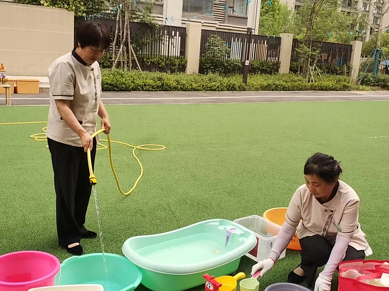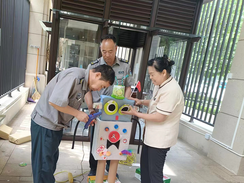 多彩童年,歡樂無限,校園的每個角落都充斥著節日的喜悅。灃西同禮幼兒園的保潔和秩序維護員利用工作空閑時間將平日收集的紙箱、飲料瓶等變廢為寶,為活動場地加上一抹不一樣的色彩;灃西第十幼兒園的保潔早早將水盆和水桶里蓄滿水,為打水仗活動做好充足的物資供應;創新港西安交通大學附屬小學的項目人員幫助學校老師為孩子們準備精美的節日禮物;灃西第七小學的保潔耐心地把孩子的創意手工繪畫作品展擦洗至干凈無塵……他們以愛為底色,用心做好“學苑管家”。