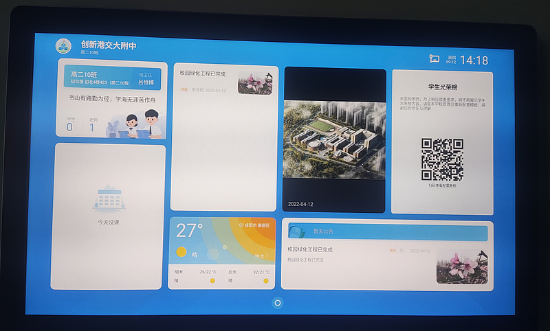 智慧教育應(yīng)用方面,采用了云端與線下“雙?!钡男问?,將班級門前電子班牌與教室內(nèi)電子白板有機互聯(lián),具備“家校留言互動”“信息快速發(fā)布”“查詢課表”“學(xué)生考勤管理”“班風(fēng)文化展示”等多種功能。
