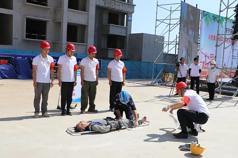 在高空墜落演練中,模擬了施工人員在施工過程中不慎墜落場景,現場應急指揮進行初步救治并聯系120將傷員送至醫院;在消防應急救援演練中,模擬了施工現場發生火災情景,項目人員運用滅火器初步控制住火勢直至消防人員抵達現場,將火災及時撲滅。整個演練過程按照預案進行,醫療救護、應急車輛、后勤保障、事故調查等應急處置各個環節井然有序。