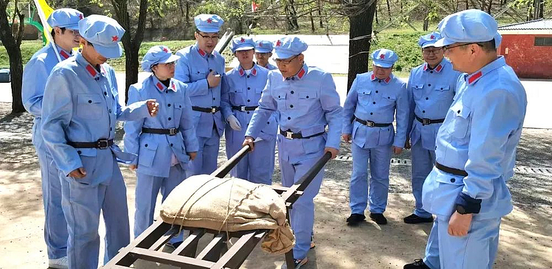 各隊學員們用獨輪車“運輸物資”,齊心協力“雷區”取水,爭先恐后完成“手榴彈”投擲體驗,在崎嶇的路上,克服道路和身體力量的阻礙,奮力前行,身臨其境地體會革命先輩在艱苦環境中頑強抗爭、勇于犧牲的革命精神。