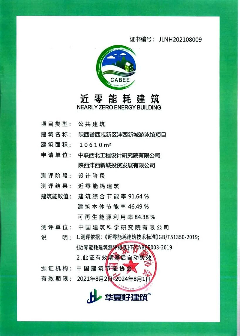 近日,西咸新區(qū)灃西新城游泳館項目,獲設(shè)計階段“近零能耗建筑”證書,標志著全國首個AAA級裝配式近零能耗游泳館,在灃西新城建成。這也是灃西新城踐行綠色發(fā)展理念積極探索“碳達峰碳中和”實現(xiàn)路徑又一力作。