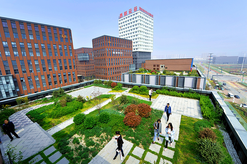 “上樓去散散步吧。”在快節(jié)奏的現(xiàn)代社會,很多被困于城市寫字樓內(nèi)的白領(lǐng),每天工作間歇最大的奢望,便是下樓找一塊綠地放松放松。然而,在灃西新城西部云谷,白領(lǐng)們只需移步樓頂,便能瞬間完成辦公室到公園的無縫切換。作為建設(shè)海綿城市的重要探索,近年來,灃西新城部分園區(qū)辦公樓上建設(shè)了綠色屋頂。屋頂花園不僅能起到吸收、凈化雨水的作用,同時還能有效減碳吸碳,降霾去熱,成為城市一道稀有景觀。