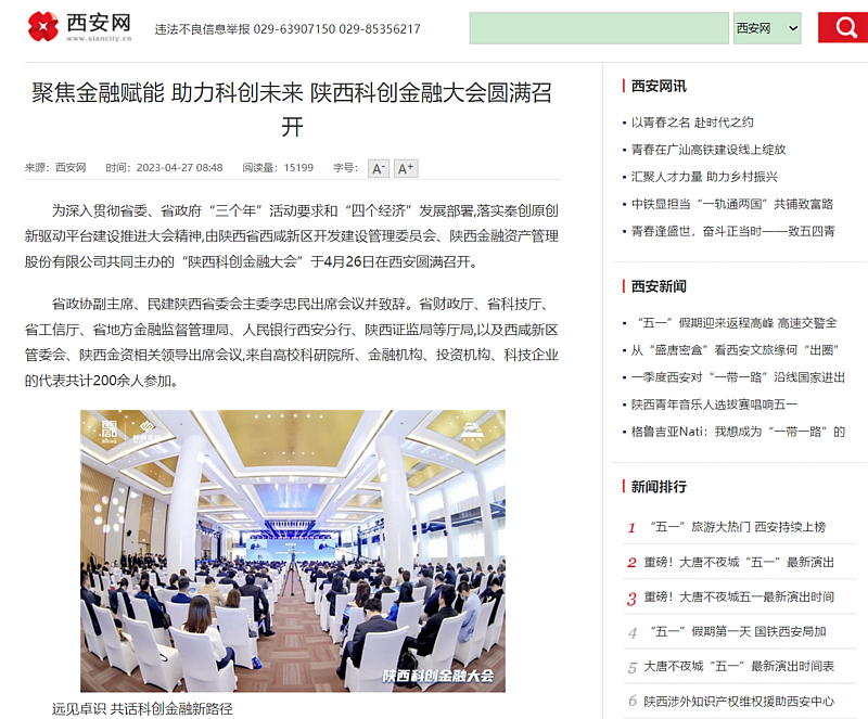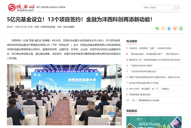 4月26日,陜西科創(chuàng)金融大會在西咸會議中心舉辦。本次活動由西咸新區(qū)和陜西金融資產(chǎn)管理股份有限公司(下稱“陜西金資”)主辦,陜西金資基金管理有限公司和西咸新區(qū)灃西新城基金管理有限公司承辦,邀請政府領導、金融專家、科學家、企業(yè)家、投資機構共同探討金融服務科創(chuàng)、助力秦創(chuàng)原發(fā)展之路,通過基金揭牌、項目簽約、金融產(chǎn)品發(fā)布等系列重磅舉措為秦創(chuàng)原科技創(chuàng)新建設注入新動能。