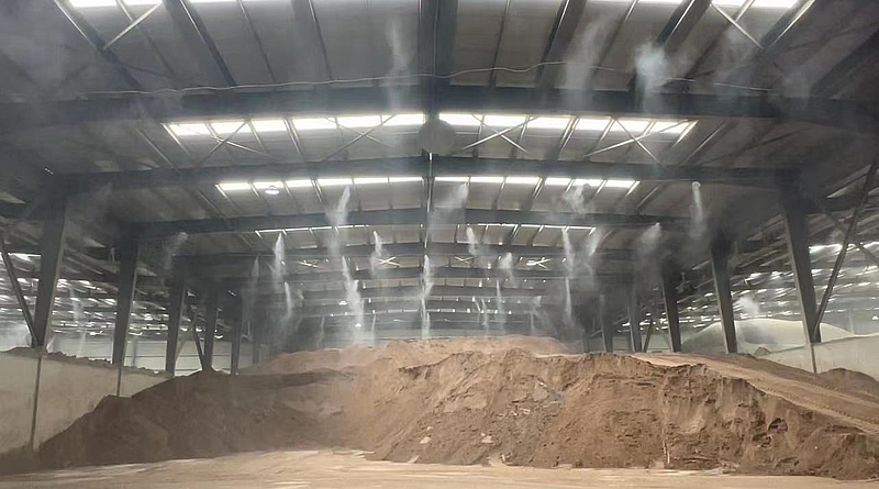 正如姚曉東所言,記者在廠區(qū)內(nèi)轉(zhuǎn)了一圈,只看見一輛輛裝成品混凝土的車輛,卻始終難覓混凝土生產(chǎn)線的影子。直到一輛突然出現(xiàn)的裝載機(jī),觸發(fā)自動(dòng)識(shí)別系統(tǒng)“打開”一個(gè)“大房子”的大門,記者跟隨機(jī)械進(jìn)入,才看到了成堆的砂石料。只見房頂密密麻麻安置的噴霧裝置,正在循環(huán)工作降塵,此處就是存儲(chǔ)砂石料的料倉。