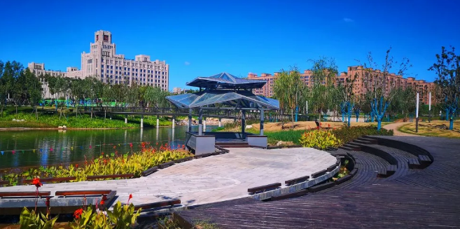 綠楔穿過五條交叉道路,被分割為六個地塊,并設(shè)五座景觀廊橋連接湖系兩岸,駁岸內(nèi)園路采用再生骨料鋪設(shè)的環(huán)保生態(tài)步行道把各個景觀節(jié)點串聯(lián)起來,匯聚成自然連接的統(tǒng)一體,為師生提供四通八達(dá)的路網(wǎng)系統(tǒng)。項目建有管理用房、田徑運動場、籃球場、足球場、網(wǎng)球場等多處運動健康設(shè)施。設(shè)置的放映廳、兒童樂園、荷影廳等功能性景觀節(jié)點,滿足師生運動、休閑、觀賞、晨讀、生活需要。占有7000平方米的中心湖系,增加了校園的寧靜和師生心情上的愉悅,與周圍學(xué)校建筑樓群相得益彰。